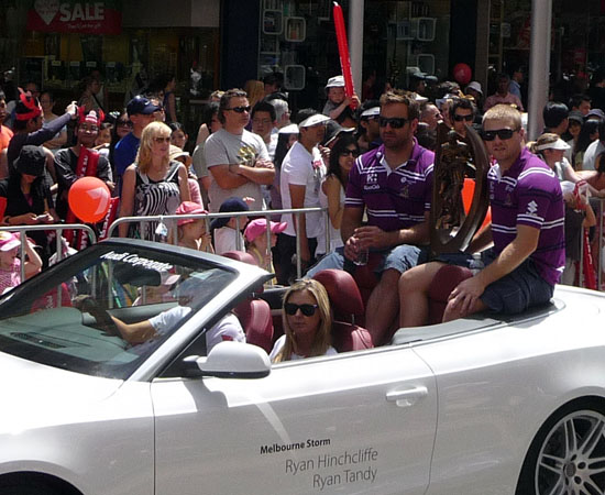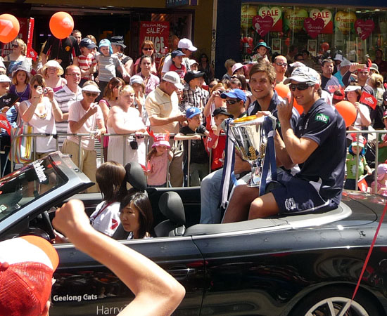 On my way home from the gym yesterday I found myself caught up in the Myer Santa Claus Parade through down the main street of Melbourne.  It’s interesting having a Christmas parade in 34 degree heat (that’s 96 farenheit).  Poor Santa must have been melting in his Santa suit by the time he arrived.  But the heat also went up as the parade of star football players were paraded past.  Melbourne can boast having won the Premierships this year for both the major football leagues here in Australia.  It’s a pretty major honor and of course we now wheel the sexy guys out for every parade that happens.